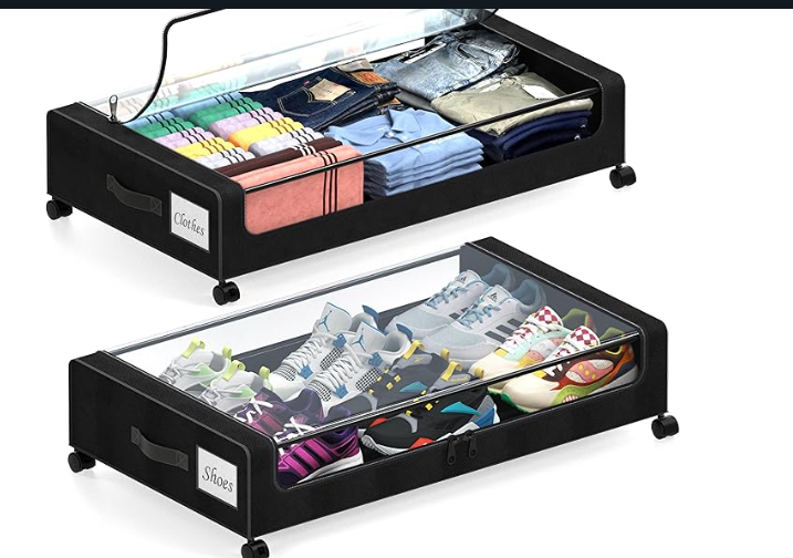 Tip: If you don’t want to change your bed frame, check out these underbed storage bins with wheels — they’re low-profile and perfect for hiding chaos.