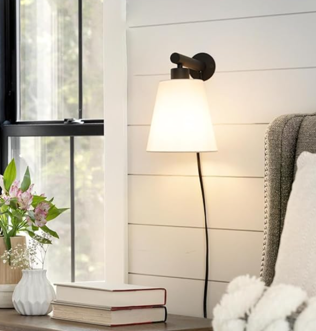 Table lamps are cute… until you realize they eat half your desk space. These plug-in sconces are a game-changer. No hardwiring needed, just plug them in and pretend you’re living in a Scandinavian hotel room.